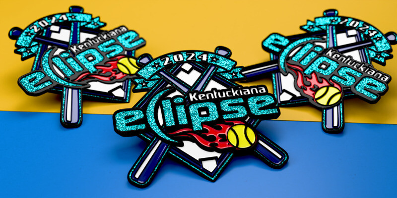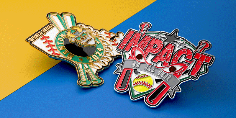 Spinners and sliders are two of the most popular upgrade options for trading pins. It turns out that people love having some kind of interactive element in their trading pins. Spinners usually take the shape of a ball, puck, or bat, but we can make just about any part of your design a spinner. As for sliders, the classic version we see for baseball and softball pins is a ball that slides across the surface as if being hit over the fence.